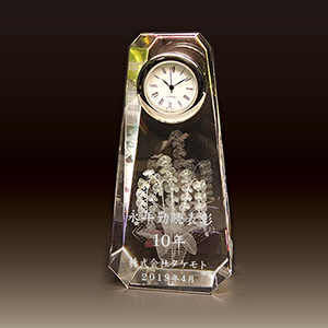 クリスタル楯(盾)の勤続表彰記念品は、すぐに飾ることができる記念品、そして名前入りのオリジナル記念品として喜んでいただいています。